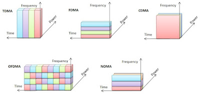 FDMA, CDMA, OFDMA and NOMA can be visualized as follows [6]. This shows how
